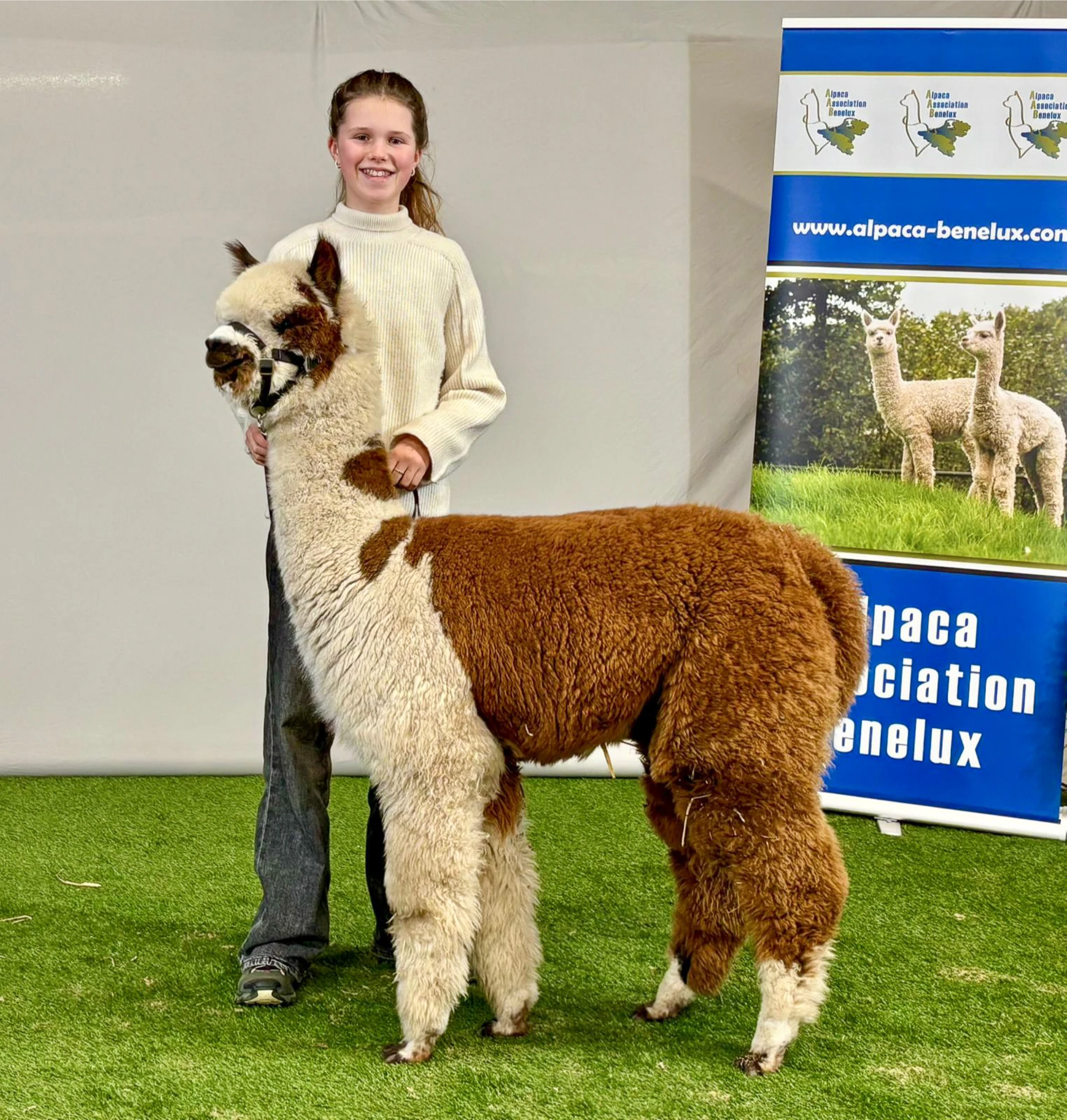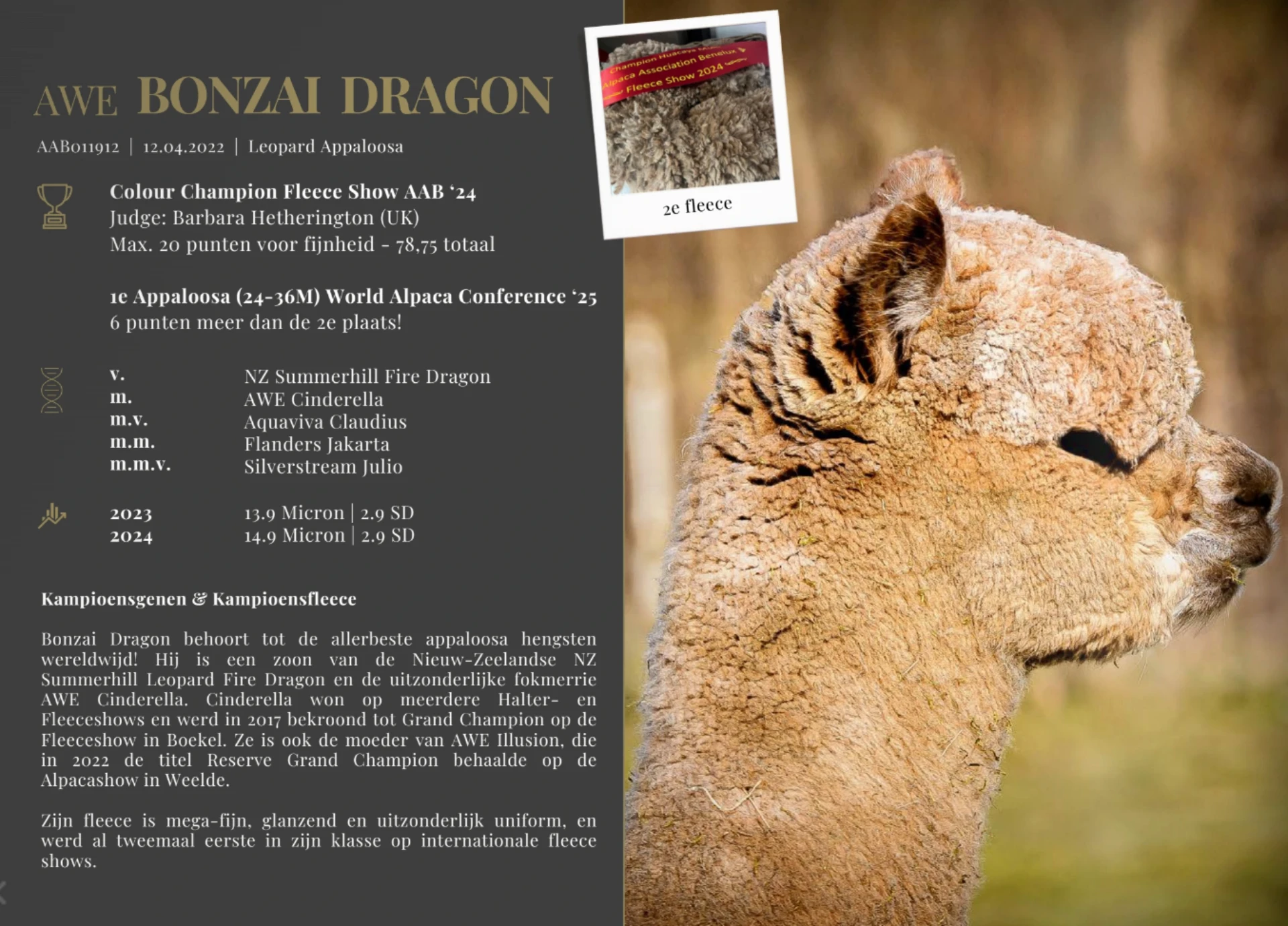 Eva is een dochter van de meervoudige internationale kampioenshengst Poet’s Worker’s Pride, die de Appaloosa genen in deze pedigree toevoegt. Dit jaar is ze voor het eerst drachtig van een Appaloosa hengst, en niet zomaar 1: AWE Bonzai Dragon! Bonzai was de Colour Champion op de AAB Fleece Show ’24 met het hoogste puntentotaal ooit voor een Appaloosa hengst op een AAB fleece show, ook op de World Alpaca Conference wist zijn fleece indruk te maken, met een indrukwekkende 1e plaats in zijn klasse en maar liefst 6 punten meer dan de 2e plaats!